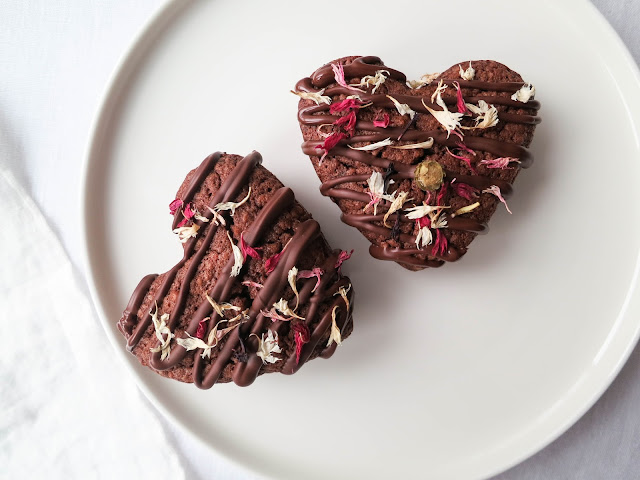 Vor dem Servieren 50g dunkle Schokolade in einem Pfännchen vorsichtig schmelzen und Herzen mit der Schokoladenglasur sowie den getrockneten essbaren Blüten dekorieren.